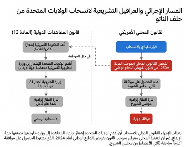 وبعد انقضاء مدة العام، تنتهي العضوية قانونياً. ولا تتطلب هذه الإجراءات تقديم مسوغات استراتيجية، أو تحمل أعباء مالية، أو الحصول على موافقة مجلس شمال الأطلسي. وفي حال قررت الولايات المتحدة الانسحاب، يتطلب الإطار القانوني قيام السلطة التنفيذية الأمريكية بتقديم إشعار الانسحاب إلى وزارة خارجيتها -نظراً لكون واشنطن جهة الإيداع الرسمية للمعاهدة- مما يعني فعلياً إخطار نفسها – قبل تعميم الإعلان على بقية الدول الحليفة.