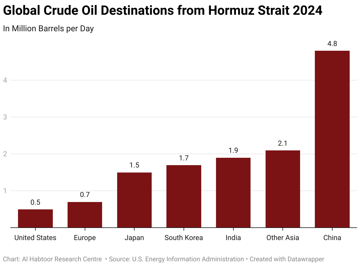 One of the world’s most important, strategic and vital oil transport gateways, the strait of Hormuz, located between Oman and Iran, connects the Arabian Gulf with the Gulf of Oman and the Arabian Sea and is considered one of the world’s most important and strategic locations for international trade. It plays a role in handling the passage of some of the world’s largest crude oil tankers as it is characterized by its depth and width. The Strait of Hormuz plays a critical role in maintaining the stability and efficiency of the international energy market and is considered a major global lifeline. Approximately 20% to 25% of total global oil consumption, which translates to 20 million barrels per day (b/d), travels through this unique waterway. Reflecting on numbers, oil flow through the Strait in 2024 averaged 20 million (b/d), or the equivalent of about 20% of global petroleum liquids consumption. These numbers encompass a substantial portion of crude oil originating from major oil-exporting nations, including Saudi Arabia, Iraq, the United Arab Emirates (UAE), Kuwait, Iran, and Qatar. The economies of Gulf states rely heavily on these vast energy exports, as they are considered the primary source of funding for national budgets, enabling these states to continuously develop their infrastructure, sustain social welfare programs, and maintain the well-being of their respective populations. On the other hand, fast-growing economies, particularly in China, India, Japan and South Korea, among others, which are characterized by their rapid industrialization process, depend heavily on a consistent and affordable means of energy flow for the Middle East via Hormuz strait, this is to fuel their industries and to drive up their economic growth.